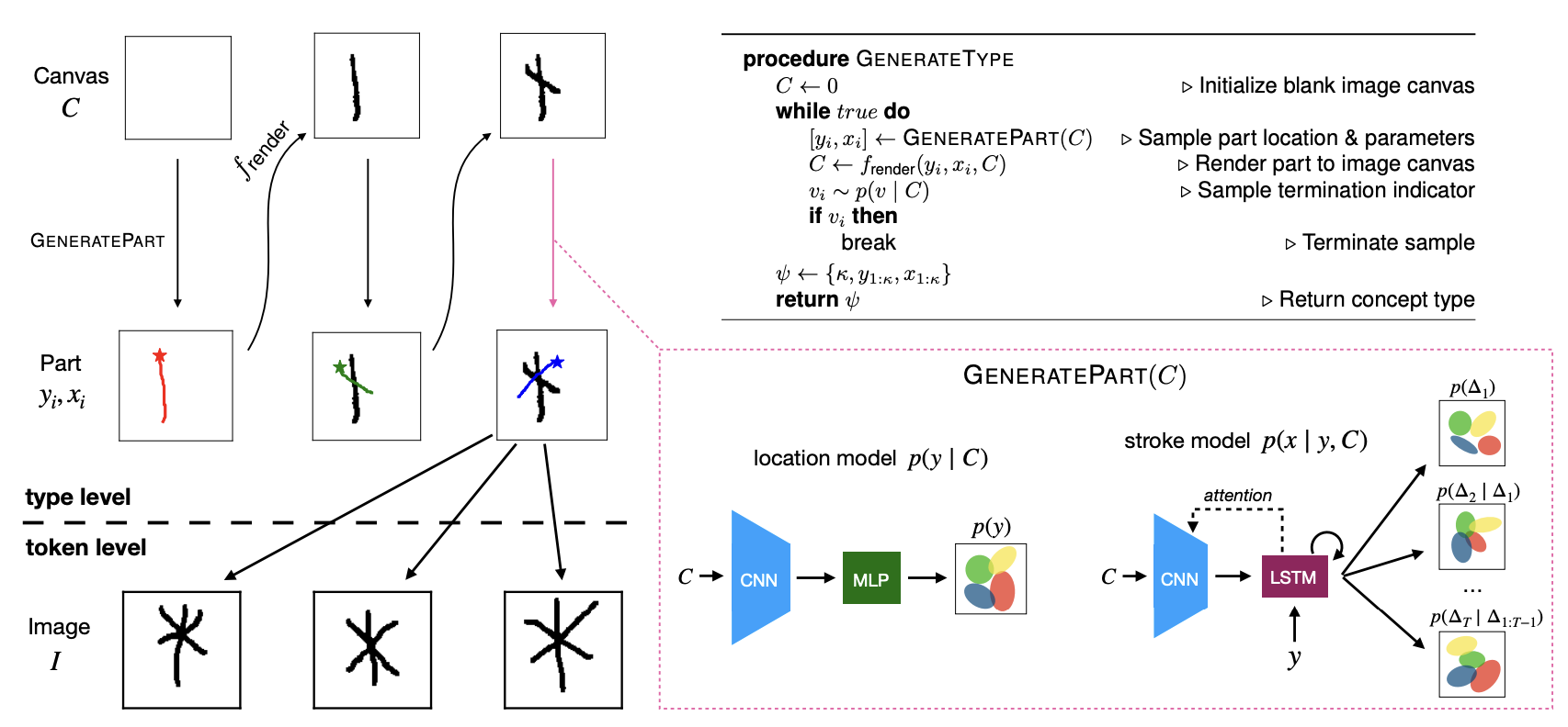 The result is a highly structured Bayesian generative model containing both discrete components (e.g. strokes) and continuous components (e.g. the location of the next stroke is a continuous variable). It combines symbolic primitives (strokes) as well as standard ANN components. This combination of using symbols and neural networks is known as a neuro-symbolic approach.